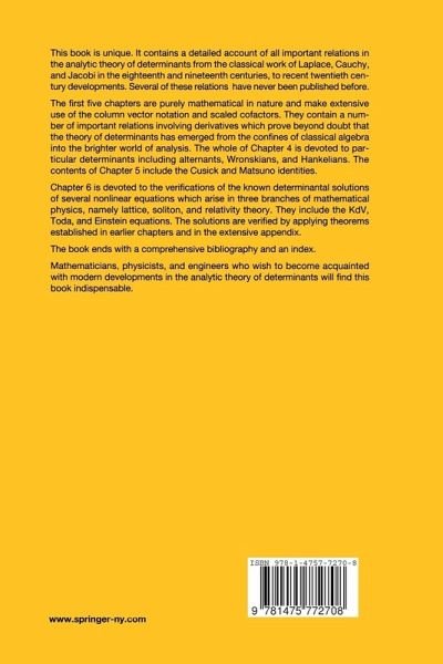 The last treatise on the theory of determinants, by T. Muir, revised and enlarged by W. H. Metzler, was published by Dover Publications Inc. in 1960. It is an unabridged and corrected republication of the edition ori- nally published by Longman, Green and Co. in 1933 and contains a preface by Metzler dated 1928. The Table of Contents of this treatise is given in Appendix 13. A small number of other books devoted entirely to determinants have been published in English, but they contain little if anything of importance that was not known to Muir and Metzler. A few have appeared in German and Japanese. In contrast, the shelves of every mathematics library groan under the weight of books on linear algebra, some of which contain short chapters on determinants but usually only on those aspects of the subject which are applicable to the chapters on matrices. There appears to be tacit agreement among authorities on linear algebra that determinant theory is important only as a branch of matrix theory. In sections devoted entirely to the establishment of a determinantal relation, many authors de?ne a determinant by ?rst de?ning a matrixM and then adding the words: "Let detM be the determinant of the matrix M" as though determinants have no separate existence. This belief has no basis in history.