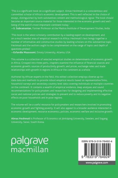 This volume is a collection of selected empirical studies on determinants of economic growth in Africa. Grouped into three parts, chapters examine the influence of financial sources and economic growth; sources of productivity growth; and prices, exchange rates and trade relationships with growth in regions in Africa or the continent as a whole. This edited book is authored by African experts in the field who employ diverse up-to-date data and methods to provide robust empirical results based on representative firms, household surveys and secondary country level data covering individuals or multiple countries on the continent. It contains a wealth of empirical evidence, deep analyses and sound recommendations for policymakers and researchers for designing and implementing effective social and national policies and strategies to prevent and to reduce poverty and its negative effects on poor households and in poor regions. The volume will be a useful resource for policymakers and researchers involved in promoting economic growth and fighting poverty. It will also appeal to a broader audience interested in economic development, resource economics, policies, economic welfare and inclusive growth.