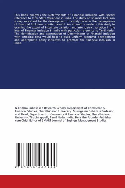 This book analyzes the Determinants of Financial Inclusion with special reference to Inter-State Variations in India. The study of Financial Inclusion is very important for the development of society because the consequence of Financial Exclusion is quite harmful. An attempt is made in this study to examine the extent of interstate variation and inter-district variation in the level of Financial Inclusion in India with particular reference to Tamil Nadu. The identification and examination of Determinants of Financial Inclusion with empirical data would help to build uniform economic development and appropriate policy initiatives to promote the financial inclusion in India.