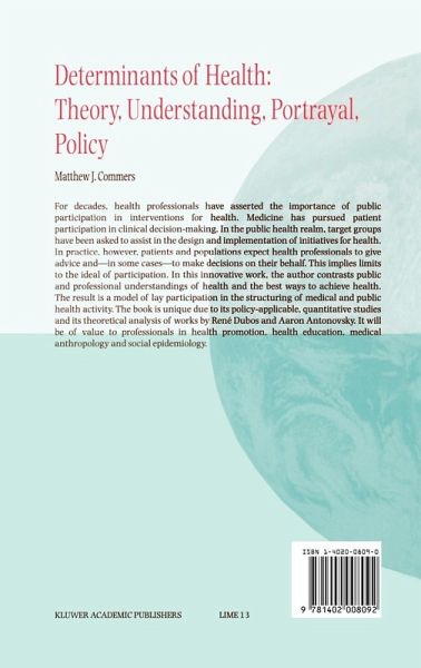 For decades, health professionals have asserted the importance of public participation in interventions for health. Medicine has pursued patient participation in clinical decision-making. In the public health realm, target groups have been asked to assist in the design and implementation of initiatives for health. In practice, however, patients and populations expect health professionals to give advice and - in some cases - to make decisions on their behalf. This implies limits to the ideal of participation. In this innovative work, the author contrasts public and professional understandings of health and the best ways to achieve health. The result is a model of lay participation in the structuring of medical and public health activity. The book is unique due to its policy-applicable, quantitative studies and its theoretical analysis of works by René Dubos and Aaron Antonovsky. It will be of value to professionals in health promotion, health education, medical anthropology, and social epidemiology.