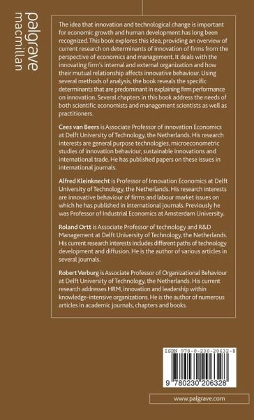AMAL AMAROUCH is a Ph.D. candidate at Ecole Polytechnique de Montréal, Canada. SPYROS ARVANITIS is Senior Researcher at the KOF Swiss Economic Institute of the ETH Zurich. He is head of the Research Division 'Structural Change' of this institute and Lecturer in economics at the ETH Zurich. TORSTEN BRODT holds a business degree from the University of Mannheim and received his PhD in innovation research from the University of St. Gallen in Switzerland and is currently employed at Swissom. LUC CASSIVI is an associate professor in the Department of Management and Technology at the Université du Québec à Montréal, Canada. He received his Ph.D from École Polytechnique de Montréal, Canada and École Centrale de Paris, France. VITTORIA CHIESA is full professor of R&D Strategy and Organisation at Politecnico di Milano. He is member of the Management Council of MIP - Business School, where he is responsible of the Technology Strategy Area. DORIS FAY is a full professor of Work and Organisational Psychology at University of Potsdam, Germany. She was awarded her PhD in Psychology from University of Amsterdam, after which she lectured at the University of Giessen, Germany and Aston University, UK. FEDERICO FRATTINI is PhD candidate in Management, Economics and Industrial Engineering at Politecnico di Milano. He was lecturer in Business Economics and Organisation at Università Vita-Salute San Raffaele, and previously at Università Carlo Cattaneo LIUC. MICHAEL FRITSCH is Professor of Economics and Chair of Business Dynamics, Innovation, and Economic Change at the Friedrich Schiller University Jena, Germany. He is also Research Professor at the German Institute for Economic Research (DIW-Berlin) and at the Max-Planck Institute for Economics, Jena. ALFRED KLEINKNECHT is Professor of Innovation Economics at Delft University of Technology. Previously he was Professor of Industrial Economics at Amsterdam. SEBASTIAN KNOLL holds a degree in industrial management and engineering from the Technical University of Berlin and received his PhD in corporate strategy research from the University of St. Gallen in Switzerland. ELISABETH LEFEBVRE is professor in the Department of Mathematics and Industrial Engineering at École Polytechnique in Montréal. She received the Ph.D. degree in business administration from the University of Montréal. LOUIS A. LEFEBVRE is professor in the Department of Mathematics and Industrial Engineering at École Polytechnique in Montréal (Canada) and invited professor in the Department of Management Studies at the University of Wageningen (NL). GAËL LE HEN is at the Department of Mathematics and Industrial Engineering at École Polytechnique in Montréal (Canada). He is also an engineering practitioner. HANS LÖÖF is director of economic studies in the Division of Economics, Department of Transport and Economics, Royal Institute of Technology in Stockholm. JONATHANMICHIE is Director of the Department for Continuing Education and President of Kellogg College, University of Oxford. Previously he was Director of Birmingham Business School. PIERRE MOHNEN is professor of microeconometrics of technical change at Universiteit Maastricht, professorial Fellow at MERIT, and associate Fellow at CIRANO. ROLAND ORTT is associate professor of technology and R&D management at Delft University of Technology. He teaches in both areas. FRANZ PALM has been a professor of econometrics at Universiteit Maastricht since 1985. In 2005 he has been awarded the Royal Academy Professorship for his contributions to the theory of econometric time series models. MARIACRISTINA PIVA is Associate Professor in Economic Policy at the Universita' Cattolica del Sacro Cuore, Piacenza and Milan, Italy. SYBRAND SCHIM VAN DER LOEFF is associate professor of econometrics at Universiteit Maastricht. His research interests are in applied (micro)econometrics. MAURA SHEENAN is a Reader in Human Resource Management at the University of Brighton Business School. She was previously an Associate Professor at the Graduate School of Management, University of Dallas and a Senior Lecturer in Economics at Queen's University, Belfast. HELEN SHIPTON is Senior Lecturer at Aston Business School. Her research is on the contribution of effective people management practice to organizational effectiveness and has explored the relationship between HRM and organizationalinnovation within SME's. VIKTOR SLAVTCHEV is research assistant at the Chair of Business Dynamics, Innovation, and Economic Change at the Friedrich Schiller University Jena, Germany. AMARESH TIWARI is a research assistant and a PhD student at Universiteit Maastricht. His thesis is on the financing of innovation in Dutch firms. PAUL TROTT is Reader in Innovation Management at the Business School, University of Portsmouth. Recently he was appointed as visiting Professor of Innovation& Entrepreneurship at TU Delft, The Netherlands. CEES VAN BEERS is currently associate professor of innovation economics at Delft University of Technology. Before he was at the University of Leiden and the Free University Amsterdam. ROBERT VERBURG is associate professor of Organizational Behaviour at Delft University of Technology (TUD). Prior to joining TUD, he conducted senior-level executive search assignments for advanced technology companies. MARCO VIVARELLI gained his Ph.D. in Economics and a Ph.D in Science and Technology Policy, is Full Professor at the Catholic University of Piacenza and Senior Scientist at the European Commission-JRC-IPTS, Seville.