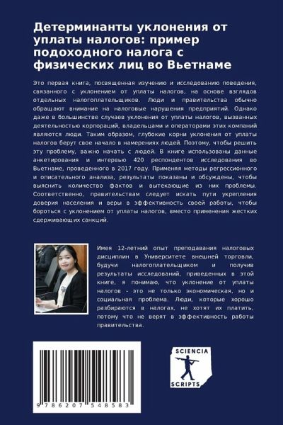 Jeto perwaq kniga, poswqschennaq izucheniü i issledowaniü powedeniq, swqzannogo s ukloneniem ot uplaty nalogow, na osnowe wzglqdow otdel'nyh nalogoplatel'schikow. Lüdi i prawitel'stwa obychno obraschaüt wnimanie na nalogowye narusheniq predpriqtij. Odnako dazhe w bol'shinstwe sluchaew ukloneniq ot uplaty nalogow, wyzwannyh deqtel'nost'ü korporacij, wladel'cami i operatorami ätih kompanij qwlqütsq lüdi. Takim obrazom, glubokie korni ukloneniq ot uplaty nalogow berut swoe nachalo w namereniqh lüdej. Poätomu, chtoby reshit' ätu problemu, wazhno nachat' s lüdej. V knige ispol'zowany dannye anketirowaniq i interw'ü 420 respondentow issledowaniq wo V'etname, prowedennogo w 2017 godu. Primenqq metody regressionnogo i opisatel'nogo analiza, rezul'taty pokazany i obsuzhdeny, chtoby wyqsnit' kolichestwo faktow i wytekaüschie iz nih problemy. Sootwetstwenno, prawitel'stwam sleduet iskat' puti ukrepleniq doweriq naseleniq i wery w äffektiwnost' swoej raboty, chtoby borot'sq s ukloneniem ot uplaty nalogow, wmesto primeneniq zhestkih sderzhiwaüschih sankcij.