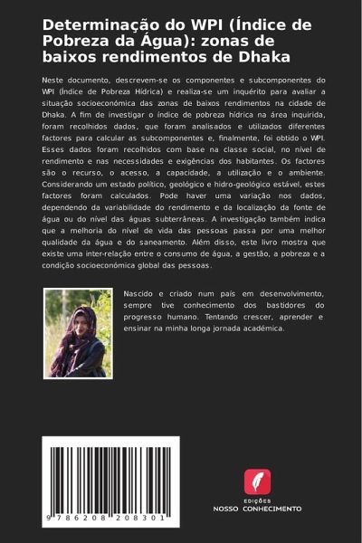 Neste documento, descrevem-se os componentes e subcomponentes do WPI (Índice de Pobreza Hídrica) e realiza-se um inquérito para avaliar a situação socioeconómica das zonas de baixos rendimentos na cidade de Dhaka. A fim de investigar o índice de pobreza hídrica na área inquirida, foram recolhidos dados, que foram analisados e utilizados diferentes factores para calcular as subcomponentes e, finalmente, foi obtido o WPI. Esses dados foram recolhidos com base na classe social, no nível de rendimento e nas necessidades e exigências dos habitantes. Os factores são o recurso, o acesso, a capacidade, a utilização e o ambiente. Considerando um estado político, geológico e hidro-geológico estável, estes factores foram calculados. Pode haver uma variação nos dados, dependendo da variabilidade do rendimento e da localização da fonte de água ou do nível das águas subterrâneas. A investigação também indica que a melhoria do nível de vida das pessoas passa por uma melhor qualidade da água e do saneamento. Além disso, este livro mostra que existe uma inter-relação entre o consumo de água, a gestão, a pobreza e a condição socioeconómica global das pessoas.