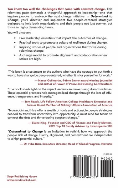 We know too well the challenges with constant change. The rapid pace of change calls for an intentional look at how we lead and inspire people to be more committed to the next change initiative. In Determined to Change, you will learn and apply five evidence-based strategies to lead meaningful change through others. These people-centered strategies are designed to help organizations and the people in them thrive in highly demanding times. You will uncover:Five leadership essentials that impact the outcomes of change. Practical tools to promote a people-centered culture during fast-paced change. Real-life stories of people and organizations that thrive during relentless change. A change model that promotes a culture of alignment and collaboration during uncertainty.