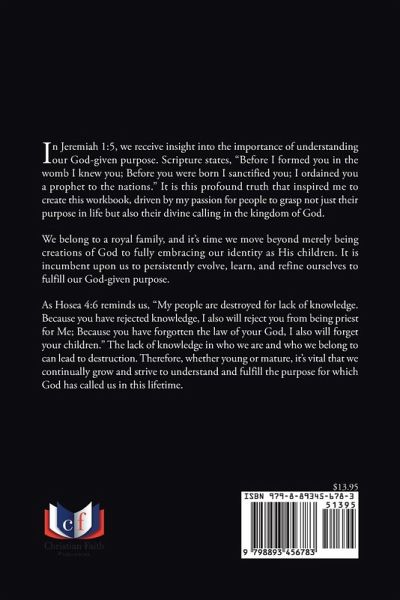 In Jeremiah 1:5, we receive insight into the importance of understanding our God-given purpose. Scripture states, "Before I formed you in the womb I knew you; Before you were born I sanctified you; I ordained you a prophet to the nations." It is this profound truth that inspired me to create this workbook, driven by my passion for people to grasp not just their purpose in life but also their divine calling in the kingdom of God. We belong to a royal family, and it's time we move beyond merely being creations of God to fully embracing our identity as His children. It is incumbent upon us to persistently evolve, learn, and refine ourselves to fulfill our God-given purpose. As Hosea 4:6 reminds us, "My people are destroyed for lack of knowledge. Because you have rejected knowledge, I also will reject you from being priest for Me; Because you have forgotten the law of your God, I also will forget your children." The lack of knowledge in who we are and who we belong to can lead to destruction. Therefore, whether young or mature, it's vital that we continually grow and strive to understand and fulfill the purpose for which God has called us in this lifetime.