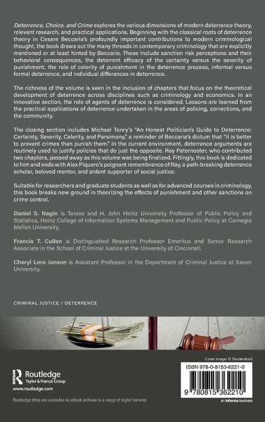 Part I. Theories of Deterrence 1. Classical Theory: The Emergence of Deterrence Theory in the Age of Enlightenment 2. The Economics of Deterrence: A Review of the Theory and Evidence 3. Perceptual Deterrence Theory 4. Criminological Theory and Deterrence Part II. Unpacking the Effects of Deterrence 5. Informal and Formal Sanctions 6. Deterrent Effects of the Certainty and Severity of Punishment 7. Celerity and Deterrence 8. Individual Difference and Deterrence Part III. Agents of Deterrence 9. Police Interventions 10. Place Management, Guardianship, and the Establishment of Order 11. Corrections and Deterrence 12. Community Members and Deterrence Part IV. Final Thoughts 13. An Honest Politician's Guide to Deterrence: Certainty, Severity, Celerity, and Parsimony 14. Remembering Ray Paternoster: Contributions to Deterrence, Criminology, and His Students
