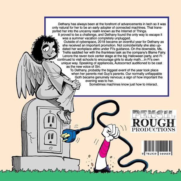 Dethany has always been at the forefront of advancements in tech so it was only natural for her to be an early adopter of connected machines. That transported her into the uncanny realm known as the Internet of Things. It proved to be a challenge, and Dethany found the only way to escape it was a summer vacation completely unplugged. Outside of cyberspace, 2018 became an eventful year for Dethany as she received an important promotion. Not coincidentally she also updated her workplace attire under Fi's guidance. On the downside, Ms. Trellis saddled her with the thankless task of being the company's Blame Fairy. Lenore the raven took center stage at the big Halloween party, and Fi continued to visit schools to encourage girls to study math...in Fi's own unique way. Speaking of appliances, Autocorrect auditioned to be cast as the new voice of Siri. To Dethany, probably the biggest event of the year took place when her parents met Guy's parents. Our normally unflappable Goth became genuinely nervous; a sign of how important the evening was to her. Sometimes machines know just how to interact.