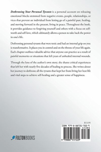 Dethroning Your Personal Tyrants is a personal account on releasing emotional blocks stemmed from negative events, people, relationships, or vices that prevent an individual from letting go of a painful past, healing, and moving forward in the present, living in peace. Throughout the book, it provides guidance to forgiving yourself and others with a focus on self-worth and self-love, which ultimately allows a person to take back the power in one's life. Dethroning personal tyrants that were toxic and had an internal grip on you is transformative. It places you in control and on the throne of your life again. Each chapter outlines valuable advice that anyone can practice as a result of painful memories or situations that left years of unhealed internal wounds. Through the lens of the author's own story, she shares critical experiences that left her with nearly five decades of healing to process. She writes about her journey to dethrone all the tyrants that kept her from living her best life and vital steps to achieve self-healing and a greater sense of happiness.