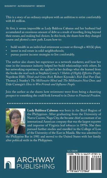 This is a story of an ordinary employee with an ambition to retire comfortably with $1 million. At first, it seems impossible as Ludy Baldoza Cabanas and her husband had accumulated an enormous amount of debt as a result of traveling, living beyond their means, and making bad choices. In this book, she shares how they changed course and plotted a new path. Learn how to: ¿ build wealth in an individual retirement account or through a 401(k) plan; ¿ invest in real estate in solid neighborhoods; ¿ pursue passive income strategies to live comfortably. The author also shares her experience as a network marketer, and how her time in the insurance industry helped her build relationships with others. In her networking experience, she applied in her dealings what she learned from the books she read such as Stephen Covey's 7 Habits of Highly Effective People, Napoleon Hill's Think and Grow Rich, Robert Kiyosaki's Rich Dad Poor Dad, Thomas J. Stanley's The Millionaire Mind and The Millionaire Next Door, and Dale Carnegie's How to Win Friends and Influence People. Join the author as she shares how retirement went from being a daunting prospect to something she could look forward to in Detour to Financial Freedom.