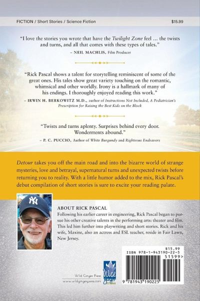 Plan your escape from the hassle of day-to-day reality into a world of fantasy. DETOUR, a compilation of short stories created by author Rick Pascal, lets you take an imaginative voyage journeying into the unknown, and often, surreal world; one replete with surprising twists, unexpected turns, and unpredicted outcomes. Using irony, a touch of the supernatural, science fiction, and an approach often similar to The Twilight Zone, E.A. Poe and O. Henry, Rick's bizarre and eerie stories are a passageway to that escape. His characters display a range of emotions that most of us have experienced or are familiar with; fear, excitement, confusion, love, greed, fanaticism, trust and betrayal...with a hint of humor in the mix. DETOUR offers reading pleasure for wide variety of ages - from teen to adult.