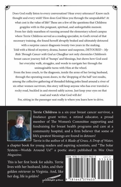 Does God really listen to every conversation? Hear every utterance? Know each thought and every wish? How does God bless you through the unspeakable? At what cost is the value of life? These are a few of the questions that Childress grapples with in this poignant, spiritual, and unforgettable memoir. From her daily marathon of running around the elementary school campus where Terrie Childress served as a reading specialist, to God's reveal of that necessary training, she found herself abruptly braked and ultimately detoured with a surprise cancer diagnosis twenty-two years in the making. Told with a blend of mystery, drama, humor and suspense, DETOURED - My Ride Through Cancer with God as Chauffeur not only chronicles Childress's breast cancer journey full of 'bumps' and blessings, but shows how God used her everyday walk, struggles, and words to navigate her through the unimaginable turns with Him at the wheel. From the lone couch, to the diagnosis, inside the arms of her loving husband, through the operating room doors, to the 'dropping of the ball' test results, among the collective gathering of threaded fishing poles lined around a river of six other women survivors, this story will keep anyone who has ever traveled a rocky road, buckled in and steered safely across. Just keep your eyes on that road and watch what God will do! For, sitting in the passenger seat really is where you learn how to drive.