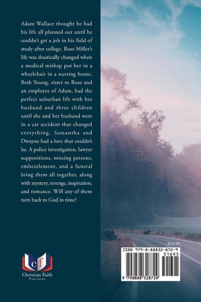 Adam Wallace thought he had his life all planned out until he couldn't get a job in his field of study after college. Rose Miller's life was drastically changed when a medical mishap put her in a wheelchair in a nursing home. Beth Young, sister to Rose and an employee of Adam, had the perfect suburban life with her husband and three children until she and her husband were in a car accident that changed everything. Samantha and Dwayne had a love that couldn't be. A police investigation, lawyer suppositions, missing persons, embezzlement, and a funeral bring them all together, along with mystery, revenge, inspiration, and romance. Will any of them turn back to God in time?