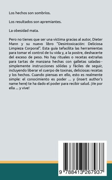 Los hechos son sombríos. Los resultados son apremiantes. La obesidad mata. Pero no tienes que ser una víctima gracias al autor, Dieter Mann y su nuevo libro "Desintoxicación: Deliciosa Limpieza Corporal". Esta guía te facilita las herramientas para tomar el control de tu vida y, a la postre, deshacerte del exceso de peso.