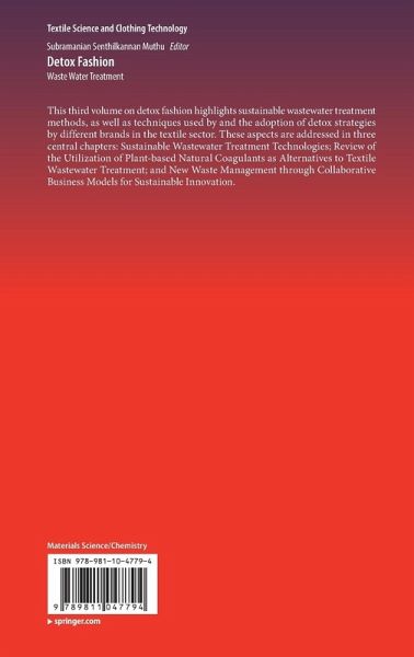 This third volume on detox fashion highlights sustainable wastewater treatment methods, as well as techniques used by and the adoption of detox strategies by different brands in the textile sector. These aspects are addressed in three central chapters: Sustainable Wastewater Treatment Technologies; Review of the Utilization of Plant-based Natural Coagulants as Alternatives to Textile Wastewater Treatment; and New Waste Management through Collaborative Business Models for Sustainable Innovation.