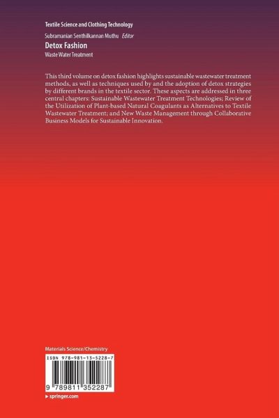 This third volume on detox fashion highlights sustainable wastewater treatment methods, as well as techniques used by and the adoption of detox strategies by different brands in the textile sector. These aspects are addressed in three central chapters: Sustainable Wastewater Treatment Technologies; Review of the Utilization of Plant-based Natural Coagulants as Alternatives to Textile Wastewater Treatment; and New Waste Management through Collaborative Business Models for Sustainable Innovation.