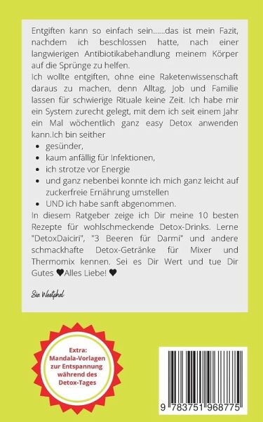 Ein gesunder Körper gehört zum höchsten Gut im Leben - sind wir krank, dann hinken wir hinter allem her. Da unser Körper vielen toxischen Faktoren ausgesetzt ist, braucht er ab und an Unterstützung in Form von Entgiftung. Die Autorin Sia Westphal hat für den Hausgebrauch 10 spritzige Rezepte für alkoholfreie Detox-Getränke entwickelt, die das Immunsystem stärken und den Darm unterstützen. Lassen Sie sich inspirieren von "Detox on the beach", "DetoxDaiciri", "Drei Beeren für Darmi" und weiteren gesunden Drinks für Körper, Geist und Seele. Die Rezepte sind simpel und können ohne viel SchnickSchnack zuhause gemixt oder im Thermomix gequirlt werden. Als Bonus gibt es 3 wunderbare Rezepte für wertvolle Entgiftungsöle und die Taschenbuchausgabe ist mit beruhigenden Mandalas zum Ausmalen ausgestattet; meditatives Malen unterstützt den Reinigungsprozess.
