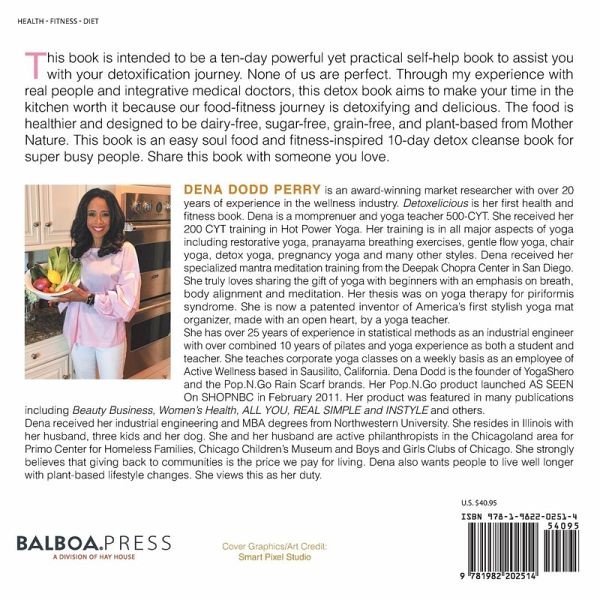Dena Dodd Perry is an award-winning market researcher with over 20 years of experience in the wellness industry. Detoxelicious is her first health and fitness book. Dena is a momprenuer and yoga teacher 500-CYT. She received her 200 CYT training in Hot Power Yoga. Her training is in all major aspects of yoga including restorative yoga, pranayama breathing exercises, gentle flow yoga, chair yoga, detox yoga, pregnancy yoga and many other styles. Dena received her specialized mantra meditation training from the Deepak Chopra Center in San Diego. She truly loves sharing the gift of yoga with beginners with an emphasis on breath, body alignment and meditation. Her thesis was on yoga therapy for piriformis syndrome. She is now a patented inventor of America's first stylish yoga mat organizer, made with an open heart, by a yoga teacher. She has over 25 years of experience in statistical methods as an industrial engineer with over combined 10 years of pilates and yoga experience as both a student and teacher. She teaches corporate yoga classes on a weekly basis as an employee of Active Wellness based in Sausilito, California. Dena Dodd is the founder of YogaShero and the Pop.N.Go Rain Scarf brands. Her Pop.N.Go product launched AS SEEN On SHOPNBC in February 2011. Her product was featured in many publications including Beauty Business, Women's Health, ALL YOU, REAL SIMPLE and INSTYLE and others. Dena received her industrial engineering and MBA degrees from Northwestern University. She resides in Illinois with her husband, three kids and her dog. She and her husband are active philanthropists in the Chicagoland area for Primo Center for Homeless Families, Chicago Children's Museum and Boys and Girls Clubs of Chicago. She strongly believes that giving back to communities is the price we pay for living. Dena also wants people to live well longer with plant-based lifestyle changes. She views this as her duty.