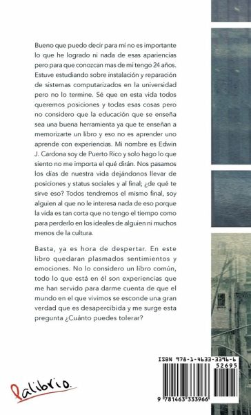 Basta, ya es hora de despertar. En este libro quedaran plasmados sentimientos y emociones. No lo considero un libro común, todo lo que está en él son experiencias que me han servido para darme cuenta de que el mundo en el que vivimos se esconde una gran verdad que es desapercibida y me surge esta pregunta ¿Cuánto puedes tolerar?
