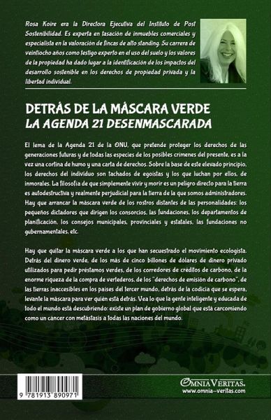 El lema de la Agenda 21 de la ONU, que pretende proteger los derechos de las generaciones futuras y de todas las especies de los posibles crímenes del presente, es a la vez una cortina de humo y una carta de derechos. Sobre la base de este elevado principio, los derechos del individuo son tachados de egoístas y los que luchan por ellos, de inmorales. La filosofía de que simplemente vivir y morir es un peligro directo para la tierra es autodestructiva y realmente perjudicial para la tierra de la que somos administradores. Hay que arrancar la máscara verde de los rostros distantes de las personalidades: los pequeños dictadores que dirigen los fideicomisos, las fundaciones, los departamentos de planificación, los consejos municipales, provinciales y estatales, las fundaciones no gubernamentales, etc. Hay que quitar la máscara verde a los que han secuestrado el movimiento ecologista. Detrás del dinero verde, de los más de cinco billones de dólares de dinero privado utilizados para pedir préstamos verdes, de los corredores de créditos de carbono, de la enorme riqueza de la compra de vertederos, de los "derechos de emisión de carbono", de las tierras inaccesibles en los países del tercer mundo, detrás de la codicia que se espera, levante la máscara para ver quién está detrás. Vea lo que la gente inteligente y educada de todo el mundo está descubriendo: existe un plan de gobierno global que está carcomiendo como un cáncer con metástasis a todas las naciones del mundo.