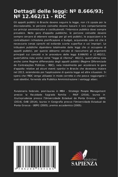Gli appalti pubblici in Brasile devono seguire la legge, non c'è spazio per la discrezionalità, le persone coinvolte devono basare il loro comportamento sui principi amministrativi e costituzionali; l'interesse pubblico deve sempre prevalere. Nelle gare d'appalto pubbliche, le persone coinvolte devono sempre cercare di ottenere vantaggi per gli enti pubblici, le acquisizioni e le contrattazioni richiedono pianificazione e budget, acquisendo solo ciò che è necessario senza sprechi ed evitando scorte superflue e usi impropri. Le istituzioni pubbliche dipendono totalmente dalle leggi che si occupano di appalti pubblici, per questo abbiamo cercato di riassumere gli argomenti principali sui concetti e le procedure delle leggi 8.666/93 e 12.462/11, quest'ultima nota anche come "legge di riforma". 462/11, quest'ultima nota anche come Regime differenziato degli appalti pubblici (Regime Diferenciado de Contratações Públicas - RDC), nata inizialmente per accelerare le gare d'appalto relative ad alcuni eventi sportivi in Brasile che dovevano iniziare nel 2013, estendendo poi l'applicazione di questa legge ad altre situazioni. Si spera che l'RDC venga utilizzato in modo corretto e che possa raggiungere i suoi obiettivi, fornendo alla Pubblica Amministrazione i vantaggi attesi.