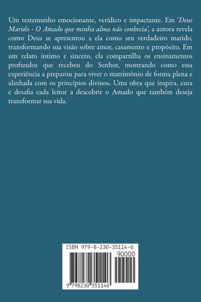 Um testemunho emocionante, verídico e impactante. Em 'Deus Marido - O Amado que minha alma não conhecia', a autora revela como Deus se apresentou a ela como seu verdadeiro marido, transformando sua visão sobre amor, casamento e propósito. Em um relato íntimo e sincero, ela compartilha os ensinamentos profundos que recebeu do Senhor, mostrando como essa experiência a preparou para viver o matrimônio de forma plena e alinhada com os princípios divinos. Uma obra que inspira, cura e desafia cada leitor a descobrir o Amado que também deseja transformar sua vida.