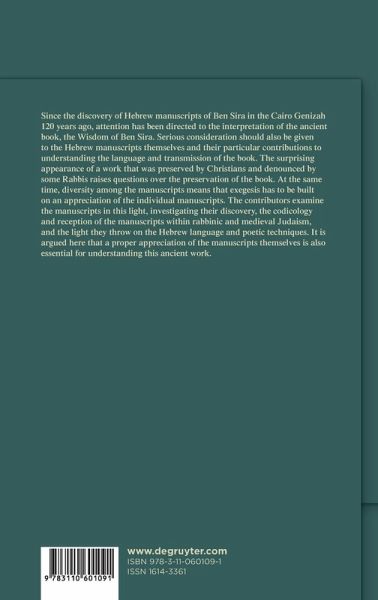 Since their discovery 120 years ago and subsequent identification of leaves, attention has been directed to the interpretation of the ancient book, the Wisdom of Ben Sira. Serious consideration should also be given to the Hebrew manuscripts themselves and their particular contributions to understanding the language and transmission of the book. The surprising appearance of a work that was preserved by Christians and denounced by some Rabbis raises questions over the preservation of the book. At the same time, diversity among the manuscripts means that exegesis has to be built on an appreciation of the individual manuscripts. The contributors examine the manuscripts in this light, examining their discovery, the codicology and reception of the manuscripts within rabbinic and medieval Judaism, and the light they throw on the Hebrew language and poetic techniques.
