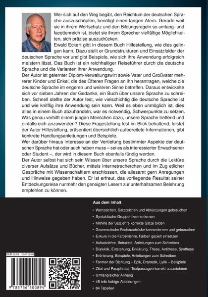 Ein Fachbuch zur deutschen Sprache, in dem die Interpunktionszeichen, die syntaktischen Gruppen, die Satzlehre, die Aufsatzlehre -- Schwerpunkt Erörterung -- sowie die Formen der Dichtung behandelt werden. Ausführungen zum Zitieren und Paraphrasieren sowie ein umfangreicher Anhang, unter anderem mit Beispielen zur Dichtung, runden die Informationen zu unserer Sprache ab. Das Werk enthält 45 Abbildungen und 85 Tabellen, die teilweise, was die Tabellen betrifft, auch als Vorlagen zum Schreiben von Aufsätzen genutzt werden können. Es wird im Großformat aufgelegt, damit Sachverhalte leicht erfasst werden können. Das Buch kann auch als Nachschlagewerk dienen.