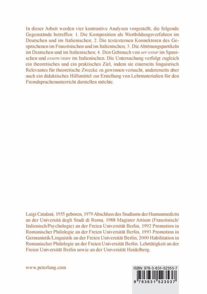 In dieser Arbeit werden vier kontrastive Analysen vorgestellt, die folgende Gegenstände betreffen: 1. Die Komposition als Wortbildungsverfahren im Deutschen und im Italienischen; 2. Die textexternen Konnektoren des Gesprochenen im Französischen und im Italienischen; 3. Die Abtönungspartikeln im Deutschen und im Italienischen; 4. Den Gebrauch von ser/estar im Spanischen und essere/stare im Italienischen. Die Untersuchung verfolgt zugleich ein theoretisches und ein praktisches Ziel, indem sie einerseits linguistisch Relevantes für theoretische Zwecke zu gewinnen versucht, andererseits aber auch ein didaktisches Hilfsmittel zur Erstellung von Lehrmaterialien für den Fremdsprachenunterricht darstellen möchte.