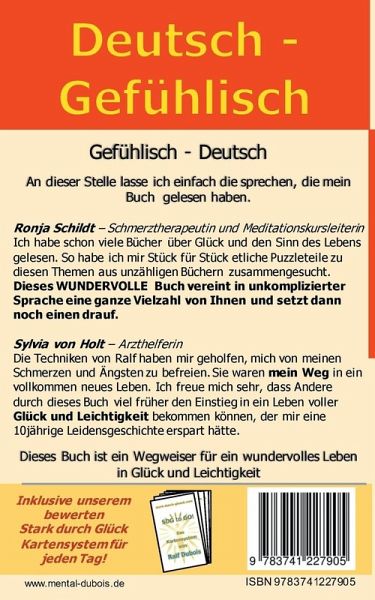 An dieser Stelle lasse ich einfach die sprechen, die mein Buch gelesen haben.Ronja Schildt, Schmerztherapeutin und MeditationskursleiterinIch habe schon viele Bücher über Glück und den Sinn des Lebens gelesen. So habe ich mir Stück für Stück etliche Puzzleteile zu diesen Themen aus unzähligen Büchern zusammengesucht. Dieses WUNDERVOLLE Buch vereint in unkomplizierter Sprache eine ganze Vielzahl von Ihnen und setzt dann noch einen drauf.Sylvia von Holt, ArzthelferinDie Techniken von Ralf haben mir geholfen, mich von meinen Schmerzen und Ängsten zu befreien. Sie waren mein Weg in ein vollkommen neues Leben. Ich freue mich sehr, dass andere durch dieses Buch viel früher den Einstieg in ein Leben voller Glück und Leichtigkeit bekommen können, der mir eine 10jährige Leidensgeschichte erspart hätte.Dieses Buch ist ein Wegweiser für ein wundervolles Leben in Glück und Leichtigkeit