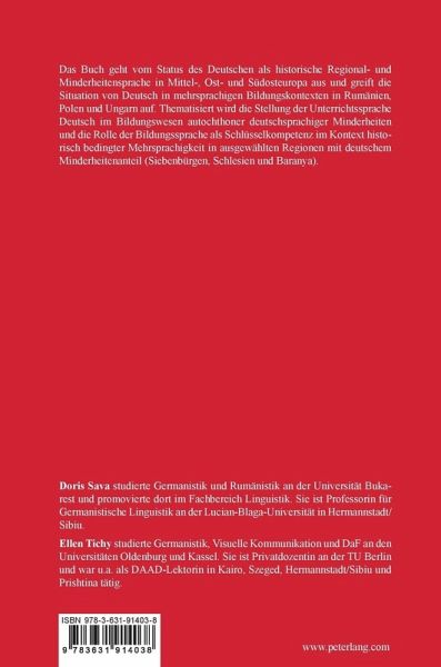Das Buch geht vom Status des Deutschen als historische Regional- und Minderheitensprache in Mittel-, Ost- und Südosteuropa aus und greift die Situation von Deutsch in mehrsprachigen Bildungskontexten in Rumänien, Polen und Ungarn auf. Thematisiert wird die Stellung der Unterrichtssprache Deutsch im Bildungswesen autochthoner deutschsprachiger Minderheiten und die Rolle der Bildungssprache als Schlüsselkompetenz im Kontext historisch bedingter Mehrsprachigkeit in ausgewählten Regionen mit deutschem Minderheitenanteil (Siebenbürgen, Schlesien und Baranya).