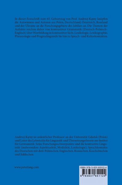In dieser Festschrift zum 65. Geburtstag von Prof. Andrzej Katny knüpfen die Autorinnen und Autoren aus Polen, Deutschland, Österreich, Russland und der Ukraine an die Forschungsgebiete des Jubilars an. Die Themen der Aufsätze reichen daher von kontrastiver Grammatik (Deutsch-Polnisch-Englisch) über Wortbildung in kontrastiver Sicht, Lexikologie, Lexikographie, Phraseologie und Pragmalinguistik bis hin zu Sprach- und Kulturkontakten.
