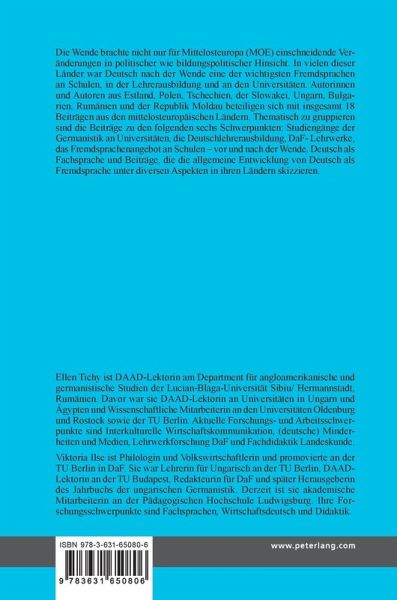 Die Wende brachte nicht nur für Mittelosteuropa (MOE) einschneidende Veränderungen in politischer wie bildungspolitischer Hinsicht. In vielen dieser Länder war Deutsch nach der Wende eine der wichtigsten Fremdsprachen an Schulen, in der Lehrerausbildung und an den Universitäten. Autorinnen und Autoren aus Estland, Polen, Tschechien, der Slowakei, Ungarn, Bulgarien, Rumänien und der Republik Moldau beteiligen sich mit insgesamt 18 Beiträgen aus den mittelosteuropäischen Ländern. Thematisch zu gruppieren sind die Beiträge zu den folgenden sechs Schwerpunkten: Studiengänge der Germanistik an Universitäten, die Deutschlehrerausbildung, DaF-Lehrwerke, das Fremdsprachenangebot an Schulen - vor und nach der Wende, Deutsch als Fachsprache und Beiträge, die die allgemeine Entwicklung von Deutsch als Fremdsprache unter diversen Aspekten in ihren Ländern skizzieren.
