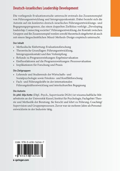 Die vorliegende Evaluationsstudie untersucht erstmals das Zusammenspiel von Führungsentwicklung und Intergruppenkontakt. Dabei bezieht sich die Autorin auf ein konkretes deutsch-israelisches Führungsentwicklungs- und Begegnungsprogramm, das einen doppelten Zielfokus verfolgt: "Developing leadership. Connecting societies". Führungsentwicklung, der Kontakt zwischen Gruppen und ihr Zusammenspiel werden sowohl theoretisch eingebettet als auch mit einem längsschnittlichen Mixed-Methods-Design empirisch untersucht.