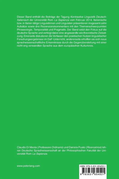 Inhalt: Fabio Mollica: Die Rolle der Kontrastivität in der Phraseodidaktik. Eine kognitive und konstruktionsgrammatische Perspektive - Sabine E. Koesters Gensini:Einzelsprachliche und kontrastive Aspekte der Funktion von Numeralien in deutschen und italienischen Phraseologismen - Simona Brunetti/Anna Gretschel/Antonella Ruggieri: Zur Phrasem-Konstruktion sicher ist sicher. Bedeutung, lexikalische Besetzungen und Kontrastivität mit dem Italienischen - Antonie Hornung:Ein neuer Blick auf die Zeit: Claudio Di Meolas Buch über Die Versprachlichung von Zukünftigkeit durch Präsens und Futur I - Maria Teresa Bianco:Die Monographie Die Versprachlichung von Zukünftigkeit durch Präsens und Futur I von Claudio Di Meola: Auswirkungen auf die Didaktik Deutsch als Fremdsprache - Lorenza Rega: Die Monographie Die Versprachlichung von Zukünftigkeit durch Präsens und Futur I von Claudio Di Meola: übersetzungs(theoretische) Fragen - Claudio Di Meola:Das deutsche Präsens aus Sicht der italienischsprachigen Lernenden - Lorenza Rega: Verlaufsformen als Übersetzungsproblem Deutsch-Italienisch-Deutsch - Dorothee Heller:Reformulierungen im Lehrdiskurs. Beobachtungen zu deutschen und italienischen Lehrveranstaltungen aus dem euroWiss-Korpus - Gabriella Carobbio: Zur Verwendung von also und italienischen Entsprechungen in Reformulierungen und Erläuterungen. Eine funktional-pragmatische Analyse universitärer Lehrveranstaltungen - Antonie Hornung:Wie unpersönlich ist man? - Über die Schwierigkeiten italienischer Deutschstudierender im Umgang mit einem unvertrauten sprachlichen Mittel - Giovanni Gobber: Interrogativität im Deutschen und im Italienischen. Ein Vergleich in funktionaler Perspektive - Daniela Puato:Direktivität und Ambiguität in Packungsbeilagen von Arzneimitteln. Eine kontrastive Studie Deutsch-Italienisch.