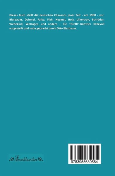Dieses Buch stellt die deutschen Chansons jener Zeit - um 1900 - vor. Bierbaum, Dehmel, Falke, Fikh, Heymel, Holz, Liliencron, Schröder, Wedekind, Wolzogen und andere - die "Brettl"-Künstler liebevoll vorgestellt und nahe gebracht durch Otto Bierbaum.