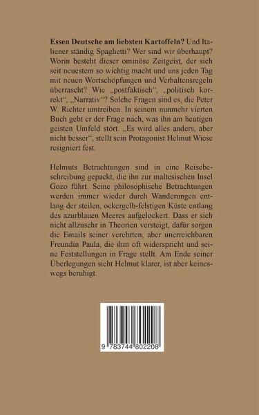 Helmut Wiese, ein "Senior im besten Alter", verbringt einen Kurzurlaub auf der maltesischen Insel Gozo, um sich über sein "Unbehagen in dieser Zeit" klar zu werden. Beseelt vom Wunsch nach möglichst objektiver Erkenntnis stützt er sich auf die Ausführungen bei Wikipedia, beispielsweise zu politischer Korrektheit, Globalisierung, Multikulturalismus, Positivismus - kurz, er unternimmt einen Streifzug durch die heute gängigen Floskeln und Phrasen in Politik und Medien. Dass er dabei nicht das Maß verliert, dafür sorgt seine angebetete, aber unerreichbare Freundin Paula. Und ebenso wirken seine…mehr