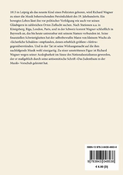 Richard Wagner: Deutsche Kunst und Deutsche Politik Entstanden 1868. Hier nach: Richard Wagner: Sämtliche Schriften und Dichtungen. Band 8, Leipzig: Breitkopf und Härtel, o.J. [1911]. Die Eigentümlichkeit der Orthographie wurde bei der vorliegenden Ausgabe beibehalten. Vollständige Neuausgabe. Herausgegeben von Karl-Maria Guth. Berlin 2015. Umschlaggestaltung von Thomas Schultz-Overhage. Gesetzt aus Minion Pro, 11 pt. Über den Autor: 1813 in Leipzig als das neunte Kind eines Polizisten geboren, wird Richard Wagner zu einer die Musik beherrschenden Persönlichkeit des 19. Jahrhunderts. Ein bewegtes Leben lässt ihn vor politischer Verfolgung wie auch vor seinen Gläubigern in zahlreichen Orten Zuflucht suchen. Nach Stationen u.a. in Königsberg, Riga, London, Paris, und in der Schweiz kommt Wagner schließlich in Bayreuth an, das bis heute untrennbar mit seinem Namen verbunden ist. Seine finanziellen Schwierigkeiten hat der selbstbewußte Mann von kleinem Wuchs als »lächerliche Schulden« empfunden, denen erheblich größere »Aktiva« gegenüberstünden. Und in der Tat ist seine Wirkungsmacht auf die ihm nachfolgende Musik wohl einzigartig. Zu einer umstrittenen Figur ist Richard Wagner wegen seiner Auslegbarkeit im Sinne des Nationalsozialismus geworden, der er maßgeblich durch seine antisemitische Schrift »Das Judenthum in der Musik« Vorschub geleistet hat.