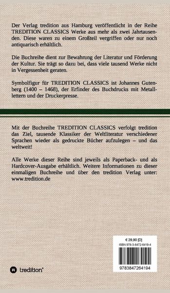 Diese Hardcover-Ausgabe ist Teil der TREDITION CLASSICS. Der Verlag tredition aus Hamburg veröffentlicht in der Buchreihe TREDITION CLASSICS Werke aus mehr als zwei Jahrtausenden. Diese waren zu einem Großteil vergriffen oder nur noch antiquarisch erhältlich. Mit TREDITION CLASSICS verfolgt tredition das Ziel, tausende Klassiker der Weltliteratur verschiedener Sprachen wieder als gedruckte Bücher zu verlegen und das weltweit! Die Buchreihe dient zur Bewahrung der Literatur und Förderung der Kultur. Sie trägt so dazu bei, dass viele tausend Werke nicht in Vergessenheit geraten.