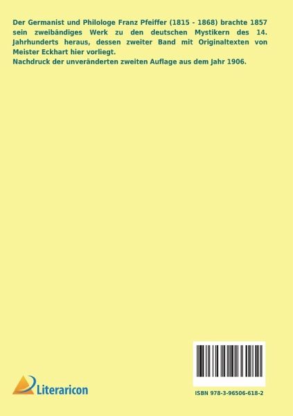 Der Germanist und Philologe Franz Pfeiffer (1815 - 1868) brachte 1857 sein zweibändiges Werk zu den deutschen Mystikern des 14. Jahrhunderts heraus, dessen zweiter Band mit Originaltexten von Meister Eckhart hier vorliegt. Nachdruck der unveränderten zweiten Auflage aus dem Jahr 1906.