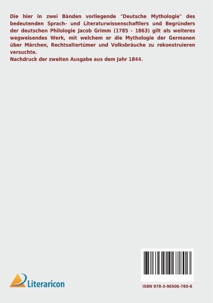 Die hier in zwei Bänden vorliegende "Deutsche Mythologie" des bedeutenden Sprach- und Literaturwissenschaftlers und Begründers der deutschen Philologie Jacob Grimm (1785 - 1863) gilt als weiteres wegweisendes Werk, mit welchem er die Mythologie der Germanen über Märchen, Rechtsaltertümer und Volksbräuche zu rekonstruieren versuchte. Nachdruck der zweiten Ausgabe aus dem Jahr 1844.