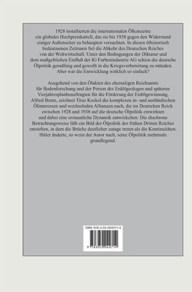 Ausgehend von den Ölakten des ehemaligen Reichsamtes für Bodenforschung und der Person des Erdölgeologen und späteren Vierjahresplanbeauftragten für die Förderung der Erdölgewinnung, Alfred Bentz, zeichnet Titus Kockel die komplexen in- und ausländischen Ölinteressen und wechselnden Allianzen nach, die im Deutschen Reich zwischen 1928 und 1938 auf die deutsche Ölpolitik einwirkten und dabei eine erstaunliche Dynamik entwickelten. Die diachrone Betrachtungsweise läßt ein Bild der Ölpolitik des frühen Dritten Reiches entstehen, in dem die Brüche deutlicher zutage treten als die Kontinuitäten. Hitler änderte, so weist der Autor nach, seine Ölpolitik mehrmals grundlegend.