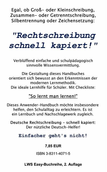 Egal, ob Groß- oder Kleinschreibung, Zusammen- oder Getrenntschreibung, Silbentrennung oder Zeichensetzung: Dieses handliche Deutsch-Buch ist insbesondere im Schulunterricht eine jederzeit griffbereite Lernhilfe. Die Gestaltung des Buches orientiert sich bewusst an den Erkenntnissen der modernen Lernmethodik und ist ebenso wegen der leicht verständlichen Beschreibung des Regelwerkes lernpädagogisch besonders hilfreich. "Deutsche Rechtschreibung - schnell kapiert!" ist ein erfolgsorientiertes Lernhilfe-Handbuch aus der LWS Easy-Buchreihe.