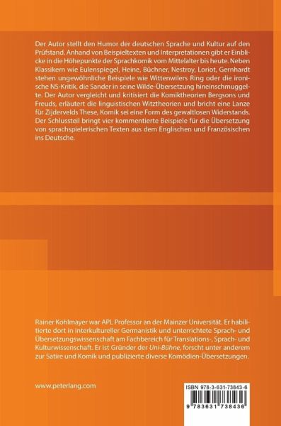 Der Autor stellt den Humor der deutschen Sprache und Kultur auf den Prüfstand. Anhand von Beispieltexten und Interpretationen gibt er Einblicke in die Höhepunkte der Sprachkomik vom Mittelalter bis heute. Neben Klassikern wie Eulenspiegel, Heine, Büchner, Nestroy, Loriot, Gernhardt stehen ungewöhnliche Beispiele wie Wittenwilers Ring oder die ironische NS-Kritik, die Sander in seine Wilde-Übersetzung hineinschmuggelte. Der Autor vergleicht und kritisiert die Komiktheorien Bergsons und Freuds, erläutert die linguistischen Witztheorien und bricht eine Lanze für Zijdervelds These, Komik sei eine Form des gewaltlosen Widerstands. Der Schlussteil bringt vier kommentierte Beispiele für die Übersetzung von sprachspielerischen Texten aus dem Englischen und Französischen ins Deutsche.