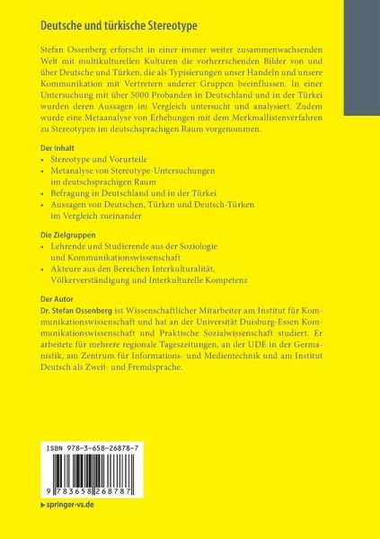 Stefan Ossenberg erforscht in einer immer weiter zusammenwachsenden Welt mit multikulturellen Kulturen die vorherrschenden Bilder von und über Deutsche und Türken, die als Typisierungen unser Handeln und unsere Kommunikation mit Vertretern anderer Gruppen beeinflussen. In einer Untersuchung mit über 5000 Probanden in Deutschland und in der Türkei wurden deren Aussagen im Vergleich untersucht und analysiert. Zudem wurde eine Metaanalyse von Erhebungen mit dem Merkmallistenverfahren zu Stereotypen im deutschsprachigen Raum vorgenommen.