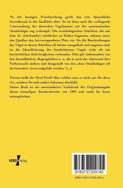 "In der heutigen Wortforschung greift das rein Sprachliche fortwährend in das Sachliche über. So ist denn auch die vorliegende Untersuchung der deutschen Vogelnamen mit der systematischen Ornithologie eng verknüpft. Die ornithologischen Schriften, die seit dem 16. Jahrhundert reichlicher zu fließen beginnen, nehmen unter den Quellen den hervorragendsten Platz ein. Da die Beschreibungen der Vögel in diesen Schriften oft höchst mangelhaft und ungenau sind, ist die Identifizierung des beschriebenen Vogels recht oft mit beträchtlichen Schwierigkeiten verbunden. Dies gilt insbesondere von den Strandläufern, Regenpfeifern u. a., die je nach der Jahreszeit ihre Farbentracht ändern und demgemäß von den alten Ornithologen oft als besondere Arten aufgefaßt werden." [...]
