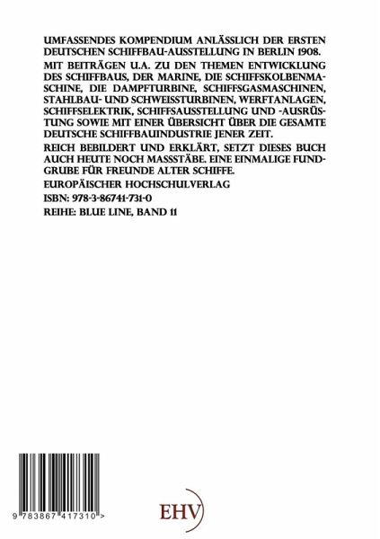 Umfassendes Kompendium anlässlich der ersten deutschen Schiffbau-Ausstellung in Berlin 1908. Mit Beiträgen u.a. zu den Themen Entwicklung des Schiffbaus, der Marine, die Schiffskolbenmaschine, die Dampfturbine, Schiffsgasmaschinen, Stahlbau- und Schweißturbinen, Werftanlagen, Schiffselektrik, Schiffsausstellung und -Ausrüstung sowie mit einer Übersicht über die gesamte deutsche Schiffbauindustrie jener Zeit. Reich bebildert und erklärt, setzt dieses Buch auch heute noch Maßstäbe. Eine einmalige Fundgrube für Freunde alter Schiffe.