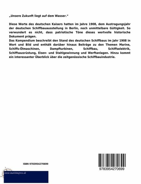 Unsere Zukunft liegt auf dem Wasser. Diese Worte des deutschen Kaisers hatten im Jahre 1908, dem Austragungsjahr der deutschen Schiffbauausstellung in Berlin, noch unmittelbare Gültigkeit. So verwundert es nicht, dass patriotische Töne dieses wertvolle historische Dokument prägen. Das Kompendium beschreibt den Stand des deutschen Schiffbaus im Jahr 1908 in Wort und Bild und enthält darüber hinaus Beiträge zu den Themen Marine, Schiffs-Ölmaschinen, Dampfturbinen, Schiffbau, Schiffselektrik, Schiffsausrüstung, Eisen- und Stahlgewinnung und Werftanlagen. Hinzu kommt ein interessanter Überblick über die zeitgenössische Schiffbauindustrie.