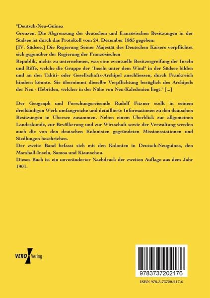 Der Geograph und Forschungsreisende Rudolf Fitzner stellt in seinem dreibändigen Werk umfangreiche und detaillierte Informationen zu den deutschen Besitzungen in Übersee zusammen. Neben einem Überblick zur allgemeinen Landeskunde, zur Bevölkerung und zur Wirtschaft sowie der Verwaltung werden auch die von den deutschen Kolonisten gegründeten Missionsstationen und Siedlungen beschrieben.