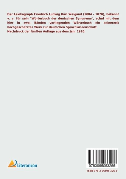 Der Lexikograph Friedrich Ludwig Karl Weigand (1804 - 1878), bekannt v. a. für sein "Wörterbuch der deutschen Synonyme", schuf mit dem hier in zwei Bänden vorliegenden Wörterbuch ein seinerzeit hochgeschätztes Werk zur deutschen Sprachwissenschaft.