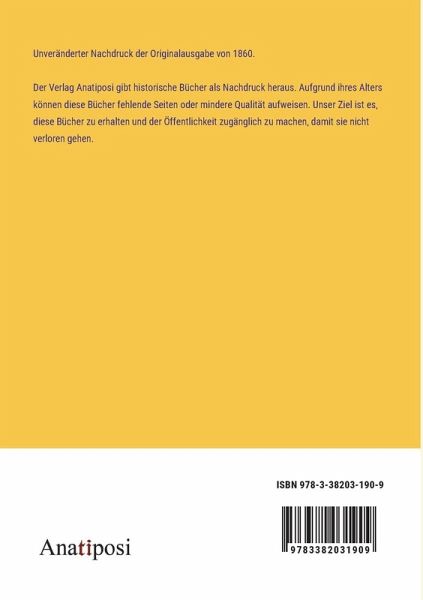 Unveränderter Nachdruck der Originalausgabe von 1860. Der Verlag Anatiposi gibt historische Bücher als Nachdruck heraus. Aufgrund ihres Alters können diese Bücher fehlende Seiten oder mindere Qualität aufweisen. Unser Ziel ist es, diese Bücher zu erhalten und der Öffentlichkeit zugänglich zu machen, damit sie nicht verloren gehen.
